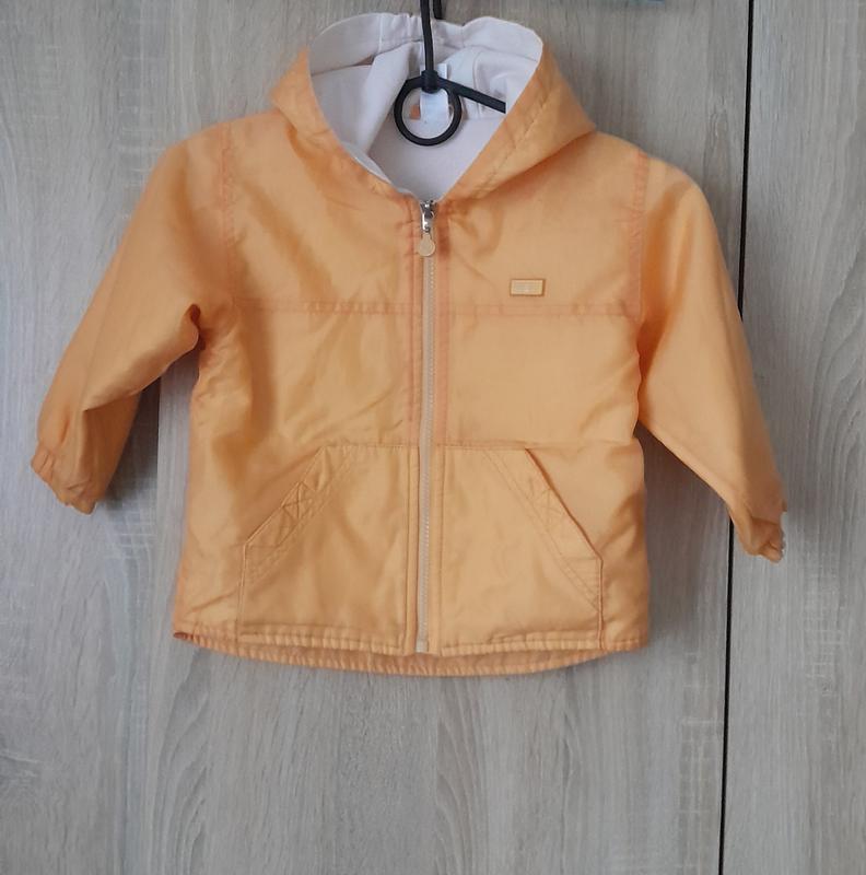 Детская куртка оранжевого цвета с капюшоном, застегивается на молнию, в красивом состоянии
