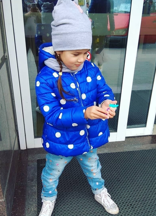 Очень красивая яркая деми курточка фирмы Next на синтепоне и флисе. Снаружи водоотталкивающая ткань. Сезон:весна- осень.Примерно от 5 градусов и выше. Размер 4-5 лет,на рост 110 см,подойдёт и до 116. Состояние отличное,без дефектов. Замеры: Длина от плеча до низа 48,5 Ширина под ручками 36 Рукав от плеча 40 Плечи 31