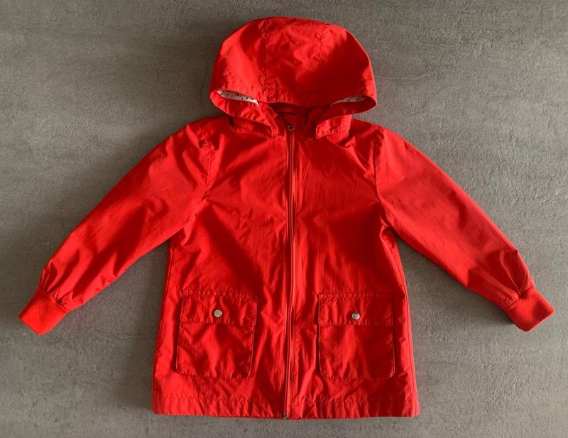 Ветронепроницаемая куртка для девочки H&M. Цвет насыщенный красный. Размер 116.Вик 5-6 лет. Замеры: Д 50 см Ш спинки 30 см Д рукава 41 см ПОГ 39 см Состав:верхний материал-100% полиэстер, подкладка-100% полиэстер. Идеальна для теплой весны,в очень хорошем состоянии. Молния, кнопки -все работает идеально.