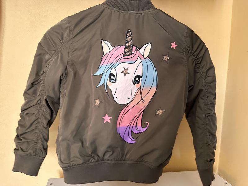Кольору хакі. Модный бомбер-курточка в очень красивом состоянии. Единорожок с блестками.