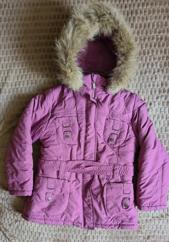 Теплая зимняя куртка с шикарным натуральным мехом. Спинка и капюшон на лесной подкладке. Капюшон и мех отстегиваются. Застежка работающая. Есть внутренние карманы. Заміри на фото. По наборке на рост 134 (9003) В подарок могу предложить комбинезон, состояние больше для двора или кататься на горах.. Длина без лямок 107 см, шаг 58 см. Лямки растянуты