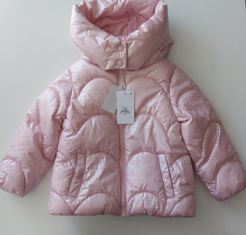 Куртка утеплена холлофайбером и флисовой подкладкой. В наличии на рост 98 см. Нежно-розовый цвет с перламутровым отблеском.