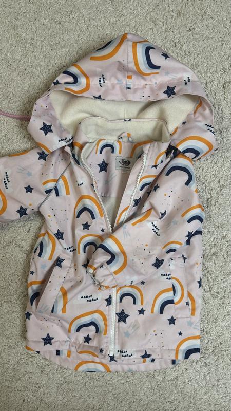 Куртка, детская, на холодную осень. Теплая, комфортная, внутри начес. Очень красивый принт. Яскрава. Фирма-'малюк енот”внизу есть маленькое пятно. На носке никак не влияет и не виден.