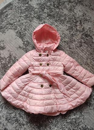 Плащик утеплен на девочку 4-5 лет (104-110). В хорошем состоянии, без видимых нюансов. Длина рукава от плеча - 42 см Полуобхват талии - 36 см. Защелкивается на замок и на кнопки, есть пояс.