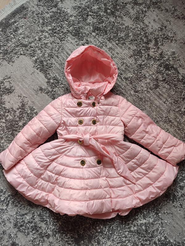 Плащик утеплений на дівчинку 4-5 років (104-110). В гарному стані, без видимих нюансів. Довжина рукава від плеча - 42 см Півобхват талії - 36 см. Защіпається на замок і на кнопки, є пояс.