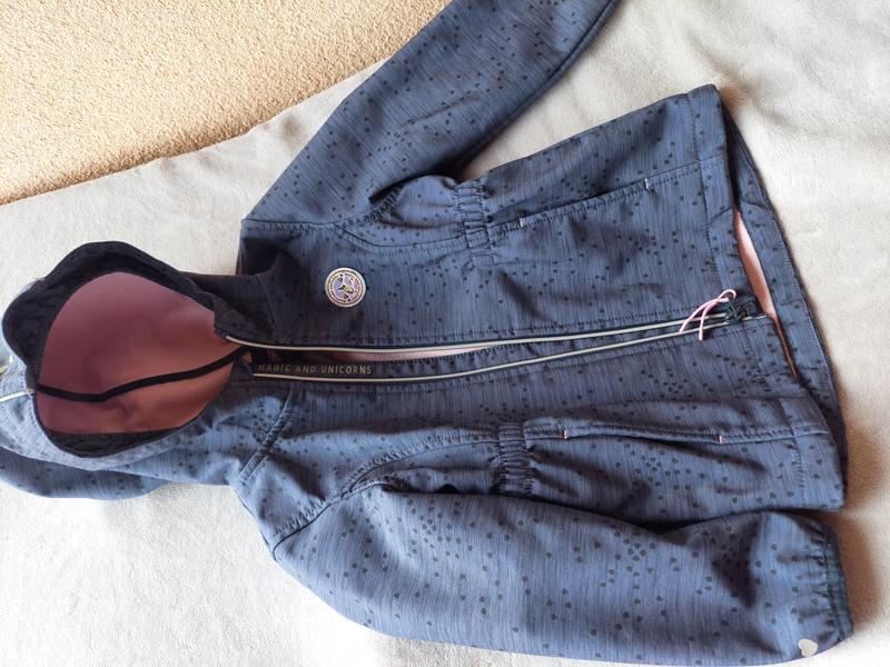 Осенняя куртка с флисом внутри.Коллир как на 1фото сверху ветронепродуваемая ткань. красиво застегивается на шее, капюшон имеет резинку. на поясе тоже есть кастор. отличный варант на ветреную осень, из недостатков маленькие не заметные. длина - 44,ширина-32,рукав-37.единорог сзади светоотражающий.