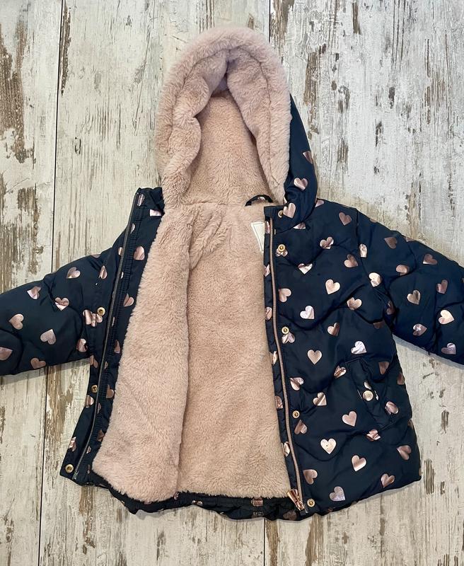Отличная теплая куртка для девочки на сезон осень/зима от Next. Почти идеальное состояние, есть незначительные стертости в нескольких местах (то что на фото). Имеет мягкую флисовую подкладку, очень приятную к телу. Размеры: Длина спереди - 44 см Длина сзади - около 47,9 см Длина рукава от плеча - 38 см