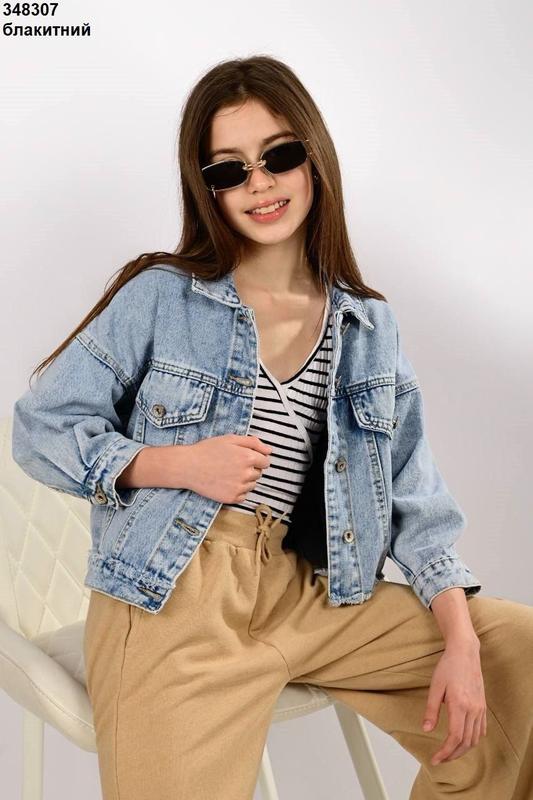 Модные детские джинсовые курточки Свободного кроя оверсайз. Низ ассиметричный. На спинке нашивка (ткань, не накат). 🏷Материал: джинс ✔Цвет: голубой ✅Размеры указаны: 130❌ 140 150 Идут на меньше!!! Заміри на фото. Размер 130 подходит на 122.