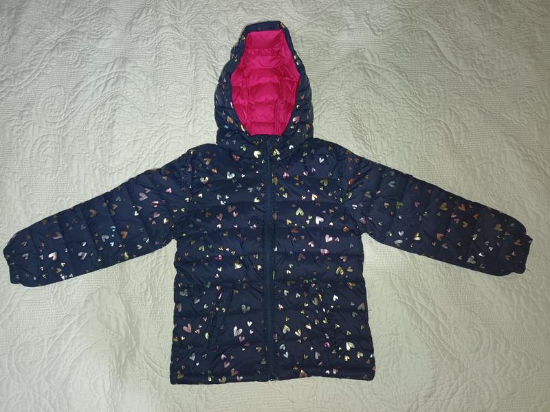 Гарна тепла куртка дівчинці на 3-4 роки. Сердечки переливаються на сонці. Водостійка і добре тримає тепло, не дивлячись на тонкий синтепон. Заміри на фото.