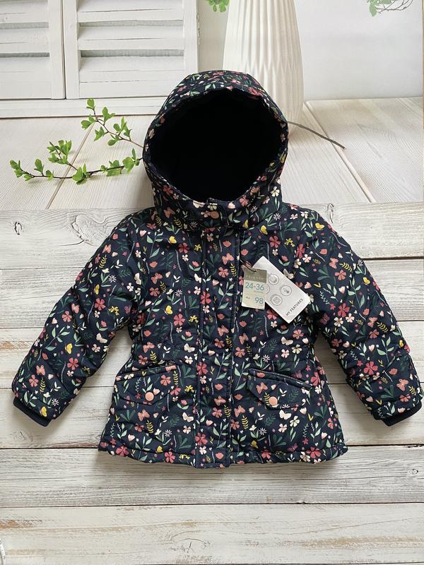 Идеальная куртка для девочки 24-36 месяцев (2-3 года), теплая на флисе Капюшон также теплый, на молнии защита для шеи, застегивается полностью закрывая шею Рукав также сделан так, чтобы в ручки не задало Куртка на молнии + дополнительно четыре кнопки, что очень удобно На холодную осень, весну и теплую зиму Устойчива к дождю и мокрому снегу, легко моется, можно просто протирать салфетками Новая с биркой