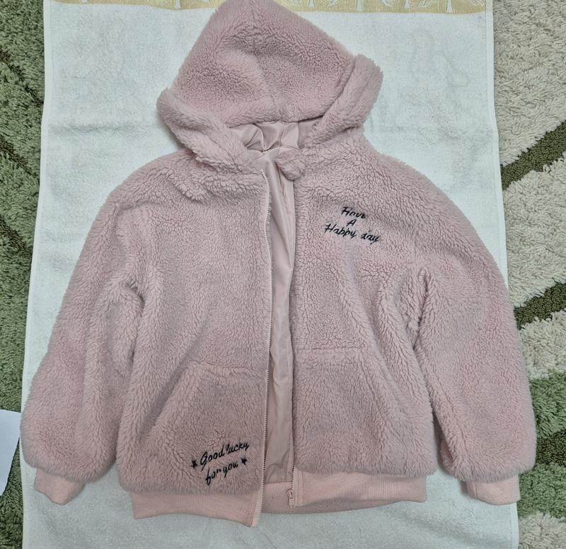 Пушистая курточка на рост 134-140, розоватый цвет, состояние хорошее. Длина 50, ширина 47, рукав 45, от шеи 56.