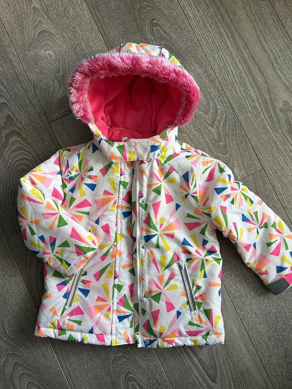 Дуже гарна і яскрава куртка для дівчинки. Стан майже ідеальний, єдиний нюанс це плямка блакитного кольору( видно на останньому фото), але так як куртка яскрава, то не дуже кидається в очі. Розмір 98-104. Ідеально на 3 роки