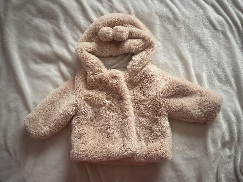 Стильная и теплая шубка для девочки бренда F&F, размер 6-9 мес, на рост 74см. Отличный вариант теплой верхней одежды для девочки. Шубка идет с капишоном, который имеет декор в виде ушек.