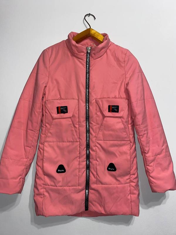 Размер 152 см. Нежно розовая курточка, имеет снаружи 2 кошени снизу и 2 кармана выше. На рукаве есть манжет.Отсутствие капюшон, на фото можно увидеть отсутствие застежки.Средние исредние целая. Подойдет на начало осени или весна. Наполнитель синтапон. Размеры: длина 71 см, рукав 60 см, обхват 35 см