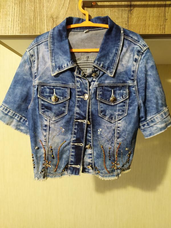 Джинсовая куртка-жилет. Украшена стразами. На спинке приталенная эластичной вставкой. В хорошем состоянии. Размер на 7-8 лет. Длина 37 см, рукав 20 см, Обхват груди 70 см.