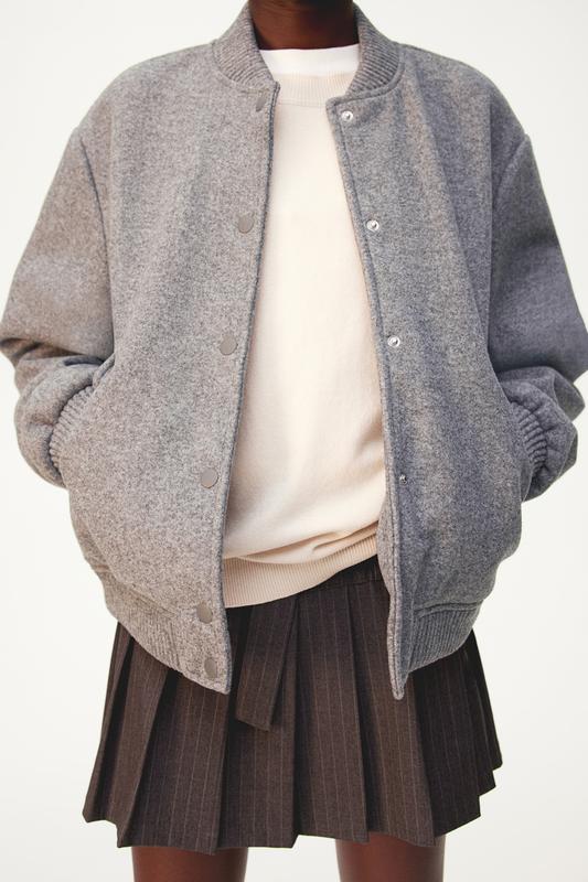 Куртка-бомбер H&M на 10-11 лет на р.146 и на 12-13 лет на р.158. Куртка-бомбер из фетровой ткани с ребристым воротником, кнопками спереди и слегка спущенными плечами. Боковые карманы с клапанами на кнопке и резинкой на манжетах и подоле. На подкладке. Состав: Полиэстер 100%. 10-11 лет. длина - 51 см, полуобхват под мышками - 49 см, длина рукава - 54 см, длина плеча - 13 см. 12-13 лет. длина - 56 см, полуобхват под мышками - 52 см, длина рукава - 58 см, длина плеча - 14 см.