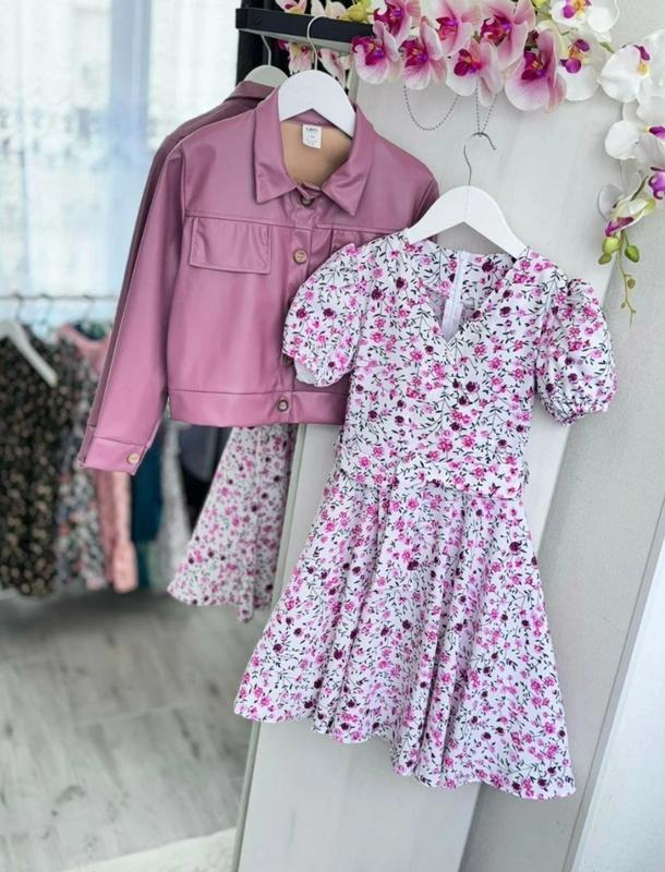 Модный комплект для девочки Ткань куртка экокожа, (в реали немного темнее) платье софт Поясок в комплекте платье длин/пог/длин куртки/пог 134 р-67/31/40/39см