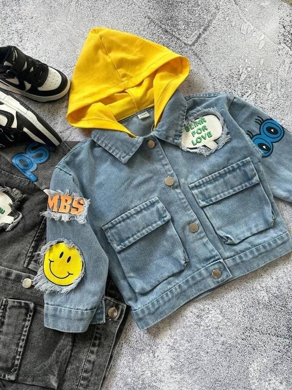 Стильная джинсовка Унисекс! Материал - мягкий джинс 100% и трикотаж двухнитка. Застегивается металлическими пуговицами. Капюшон не снимается. Желтая 90 100 110 120 Красная 90 Размер 90- Длина 35 см Рукав от горла 39 см ширина 35*2 см 100- Длина 47 см Рукав от горла 41 см ширина 36*2 см 110- Длина 41см Рукав от горла 43 см ширина 38*2 см 120- Длина 44 см Рукав от горла 47 см ширина 40*2 см