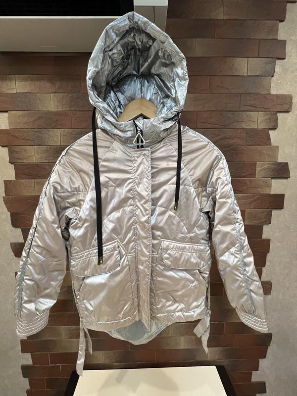 Серебряная демисезонная куртка для девочки ростом 152-158. В очень хорошем состоянии без каких-либо дефектов. Длина сзади: 67 Длина спереди 61 Длина рукава от горловины: 63 Внутренняя сторона рукава: 37 Грудь: 49