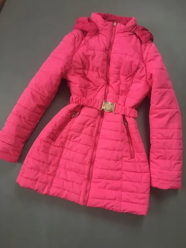 Демисезонная куртка для девочки яркого розового цвета, размер 44 по набору. Замеры: Ширина в плечах - 39 см. Ширина под подмышками - 45 см. Ширина в талии - 41 см. Ширина по низу куртки - 55 см. Длина рукава от плеча - 60 см. Длина куртки - 75 см. Куртка имеет съемный капюшон, который затягивается кулиской. Есть два кармана на молнии и один потайной кармашек. Есть пояс, можно носить и с ним, и без него. Подкладка целая, до половины флисовая. Следы ношения видны на манжетах рукавов, но они прикрыты.