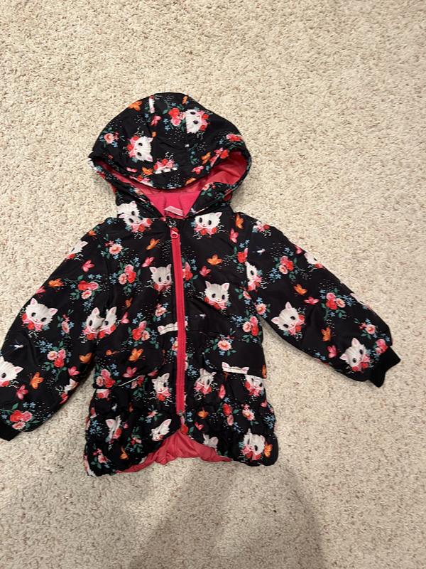 Куртка на девочку чорная с очень интересным принтом кошечки и есть внутри куртки отделение для шапки