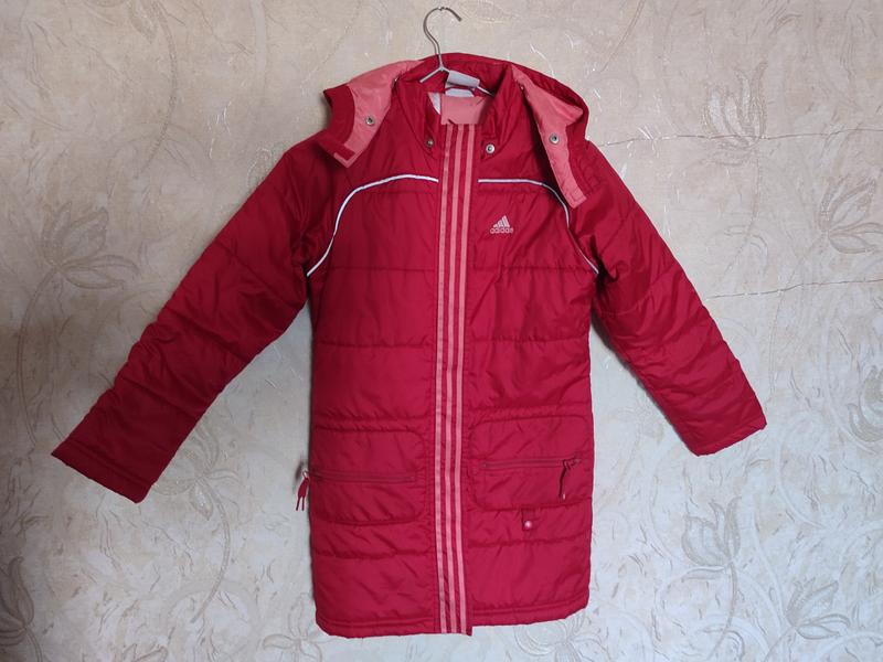 Куртка для девочки насыщенного красного цвета с светоотражающими вставками Adidas. Спортивный стиль, повседневная. Тип застежки- замок и липучки. Куртка имеет съемный капишон (крепления на кнопках). Замеры по спинке от капишона до низа куртки 72см, рукав от плеча -45см, по груди 84см, по низу курицы 88см. По спинке от края рукава до края 125см.