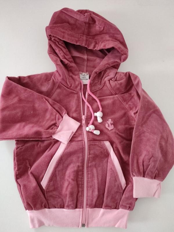 Вітровка з натурального вельвету, тканина трохи тягнеться, без підкладки, має кишені, застібається на роз'ємну блискавку. Напівоб'єм по грудях 37 см Ширина по спині 22 см Довжина рукава від горловини 38 см Довжина вітровки 39 см