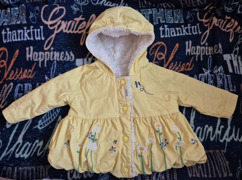 Куртка в хорошем состоянии фирмы Next на девочку 6-9 месяцев. Украшена вышивкой и нашивками. Длина спинки 28 см, длина внешнего капюшоном 47 см, длина рукава 22 см.