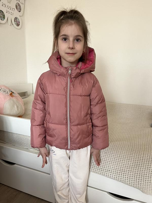 Деми куртка в идеальном состоянии, не сбита, капишон на кнопках, снимается, на рост 110, но смотрите по замерам, на фото девочке 7,5 лет Длина рукава 37 см Длинна без капишона 45 см