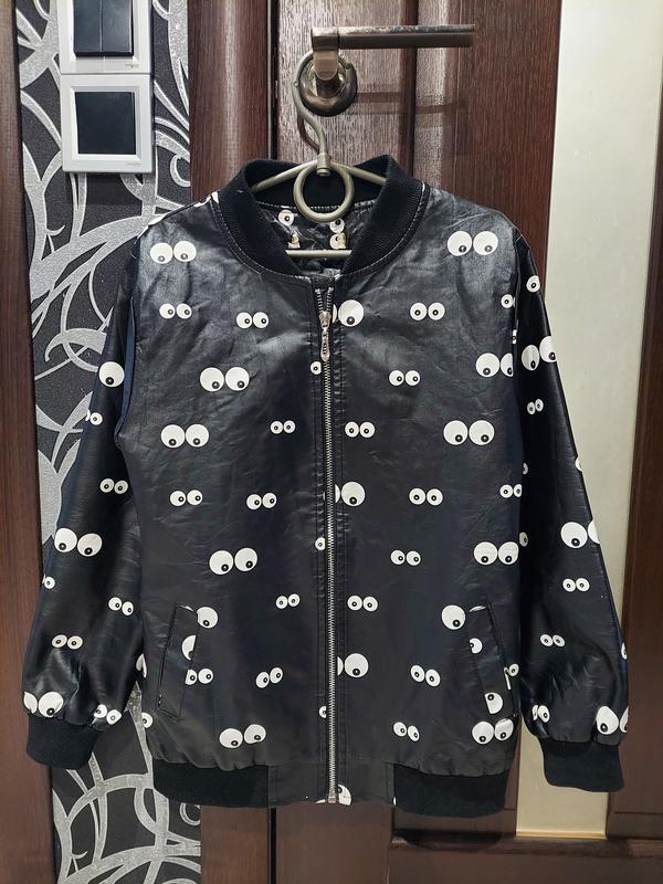 Крутая кожаная куртка бомбер с глазками, черного цвета 7-10 лет