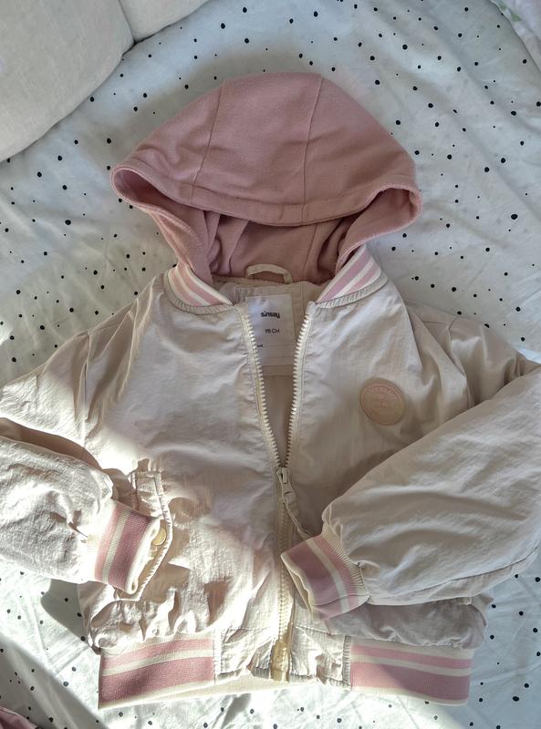 Дитячий бомбер з пришитим капюшоном Колір:бежевий з рожевим Розмір 98 •Рукав з манжетом 36см •Довжина по спинці 36 •Півобхват під рукавами 38 см Капюшон пришитий , без дефектів , плащівка витерається вологою серветкою абож гарно переться в пральній машинці, наповнювач в куртці цільний тому не збивається