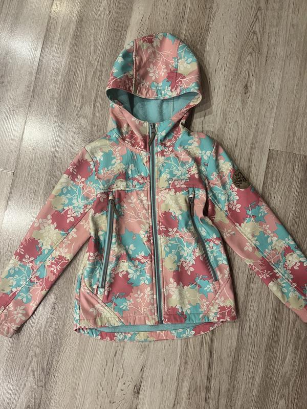 Чудова, яскрава куртка ( софтшел). На флісовом утеплювачі. Вітро водо непроникна. Довжина по спині 49, ширина 37, рукав 45.