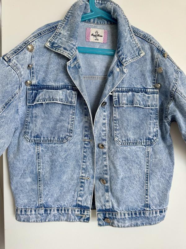 Джинсова куртка вільного крою з потертостями та подряпинами, дуже зручна та стильова. Розмір 146/150 Довжина-55см Плечі- 54см НОГ- 50см