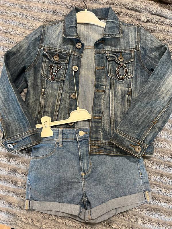 Джинсова куртка+шорти Рост 128 (подойдет на 122-134) ЗАМІРИ Куртка: Рост 128 Длина по спинке: 45см Ширина плечей: 31см Полу обхват груди: 37см Длина рукава внешняя: 48см; внутренняя: 34см Шорти: Рост 134 H&M Ширина пояса до 30см, есть внутренняя в тяжелой фиксации на резинке Длина по внешнему краю 25см