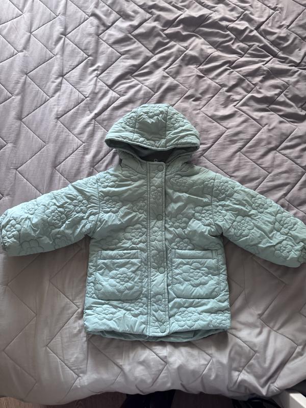 Курточка в гарному стані, на останньому фото показала, що є ледь помітні 2 плями, але то треба ну дуже придивлятись. Рукав 28 см, довжина по спині 42 см, ширина під рукавами 36 см. Утеплена синтепоном, на теплу осінь чи весну