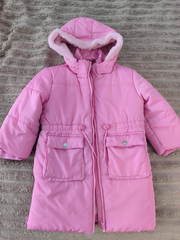 Подовжена куртка. Підклад плюшевий, мякенький. утеплення - синтепон. Довжина 61, ширина 41. Капюшон знімається.