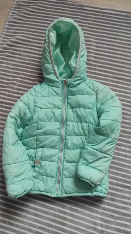 Куртка для девочки на осень, мятного цвета на 3-4 года (98-104), наполнение синтепон, в почти идеальном состоянии, капишон не отстегивается. Один минус- на замочке разогнутый хвостик.