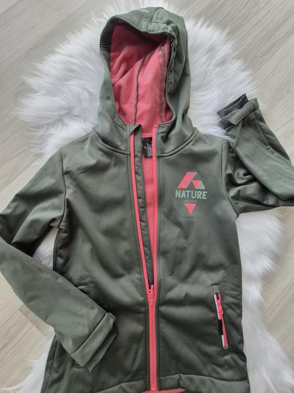 Куртка девочке, soft shell, не промокает, не продувает. Есть не большой нюанс на фото (маленькая зацепка).Цину снижено в двое Длина 54 сс,пог 36 см,рукав от плеча с манжетом 48 см.