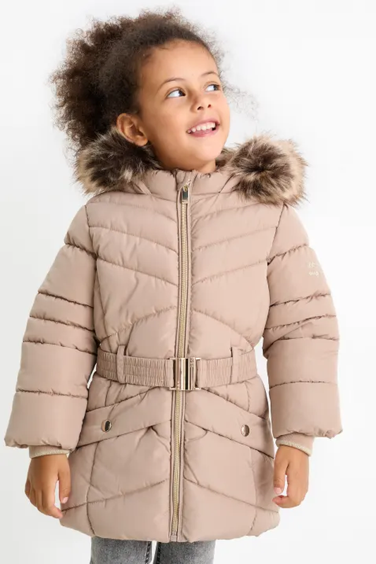 Стеганная куртка из гладкой ткани с капюшоном и отделкой из искусственного меха. Два прорезных кармана на пуговицах, пояс пояс с застежкой-кнопкой и гладкая подкладка. Застежка молния с защитой и кнопки. Цвет: светло коричневый. Состав: Основная часть и рукава: 100% полиэстер, капюшон: 100% полиэстер, отделка: 64% акрил| 19% полиэстер| 17% модакрил Рост/размер: 110 см (5Y)