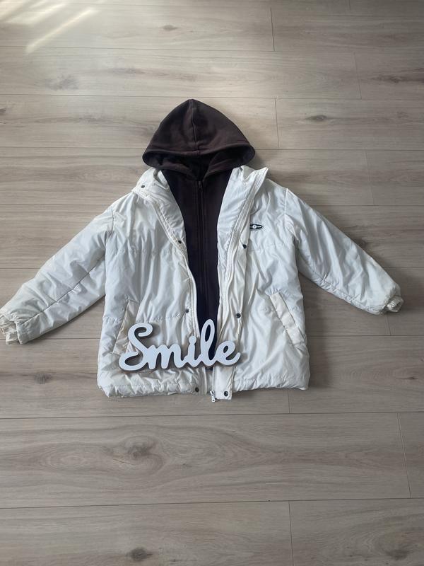 Куртка-ветровка для дівчинки з трикотажним капюшоном.Дуже стильно виглядає,адже має вигляд толстовки та куртки.Стан хороший,але є нюанси з підкладкою.На фото видно.