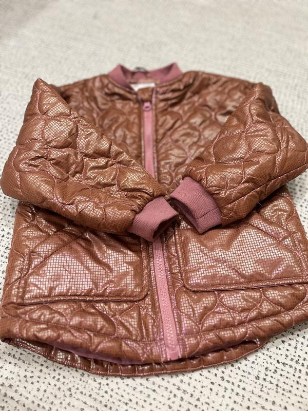 Легка демісезонна куртка. Застібка на блискавці. Дві кишені. Рукава оформлені манжетами. Голографічний єфект. На стьобаній підкладці. Гладка підкладка. Заміри: -плечі- 36,5 см; -рукав- 33 см; -груди-38,5 см; -висота спереду- 43 см; -висота ззаду-46 см.