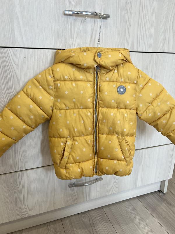 Жовта куртка у білий горошок, з капюшоном. Легка та тепла, застібається на блискавку і кнопку біля коміра. Є дві кишеньки. Заміри: • довжина – 32 см • ширина під руками – 29 см • довжина рукава – 33 см Стан відмінний, без дефектів. Підійде для осені або м’якої зими. Ціна 200