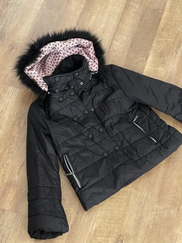 Дитяча зимова куртка для дівчинки, зріст 140 см • Стан: б/у, є нюанси (не працює застібка на одному з кишень, на рукавах видно сліди носіння — див. фото). • Матеріал: верх щільний, добре тримає тепло. • Утеплення: синтепон/поліестер (сезон осінь-зима). • Капюшон: з хутром (схоже на натуральне), всередині гарна рожево-чорна підкладка з принтом. • Фасон: коротка модель, зручна у русі, гарно виглядає на фігурі. • Колір: класичний чорний. Незважаючи на дрібні дефекти, куртка залишається теплою, стильною і може ще добре послужити.