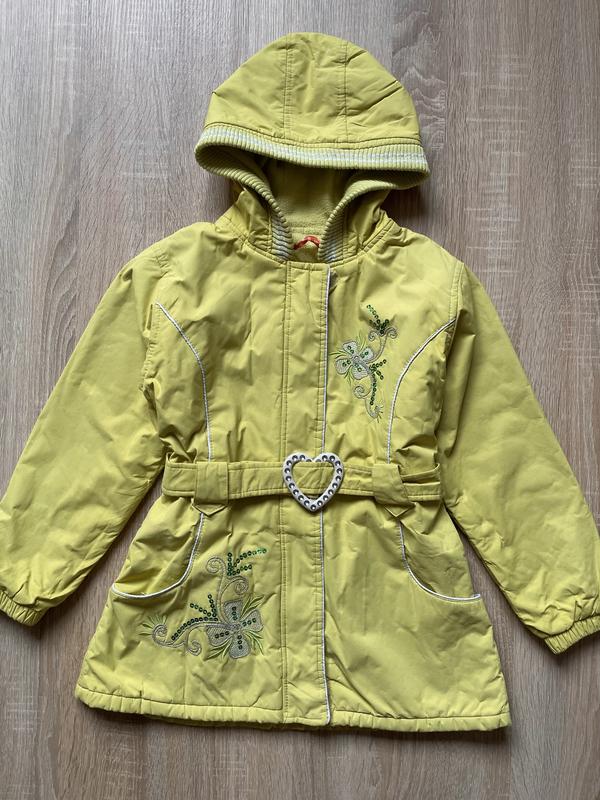 Курточка осіння / весняна, салатового кольору На приємній байковий підкладці Є капішон, кишеньки, поясок, ззаду в поясі резинка Стан поношений, є місцями потертості і потребує звичайного прання Заміри пог 43 пот 37 рукав 46 Довжина ззаду по центрі 59