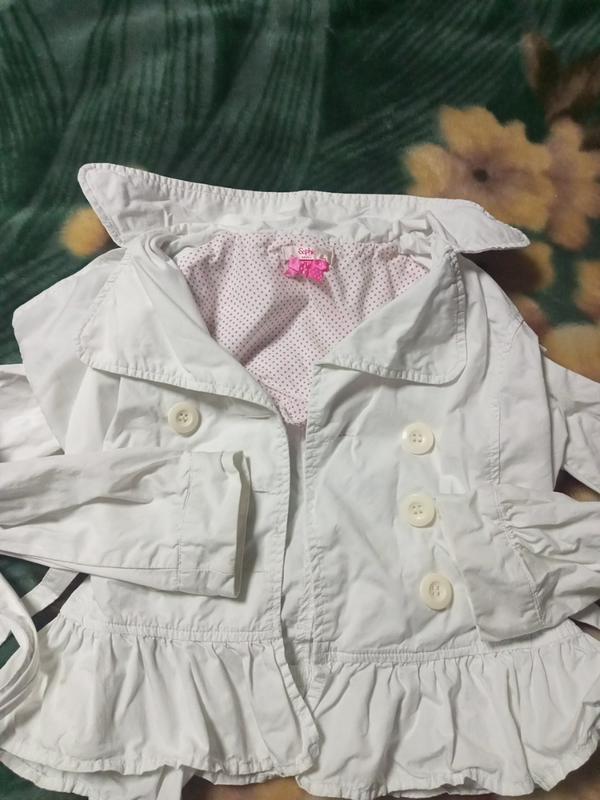 Біла курточка для дівчинки з рюшами внизу. По бірці - на 13 років. По факту - десь на 10-11, залежить від комплекції. Напівобхват - 40. Довжина - 47. Довжина рукава - 55.