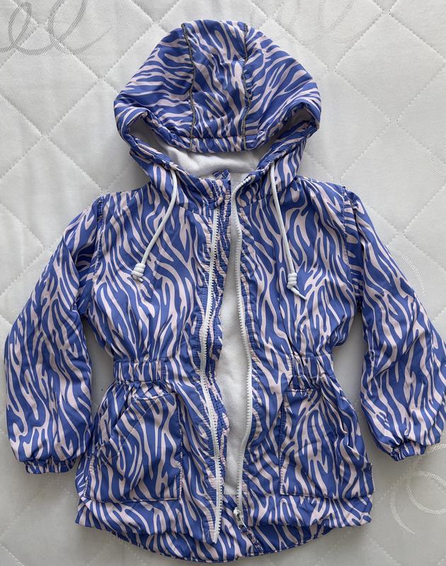 Чудова куртка демісезонна для дівчинки 2-3 років, на теплій підкладці, шилася на замовлення, дуже красива, принт зебри фіолетові і блідо-рожеві смужки, поясок на мʼякенькій резиночці, позаду подовжена, гарно закриває сіднички. Заміри додані на фото