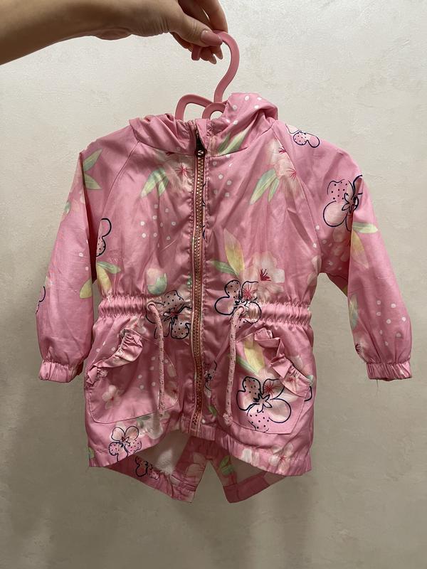 🧥 Легка вітрівка для дівчинки Куртка рожевого кольору з квітковим принтом 🌺. Має капюшон, кишеньки та куліску на талії для зручної посадки. Застібається на блискавку. Ідеальний варіант на осінь чи весну. Матеріал легкий, не пропускає вітер, швидко сохне після дощу. Усередині легке утеплення. 📏 Розмір: 74 см (6-9 місяців) заміри можу надати Стан відмінний, без плям і дефектів ✅