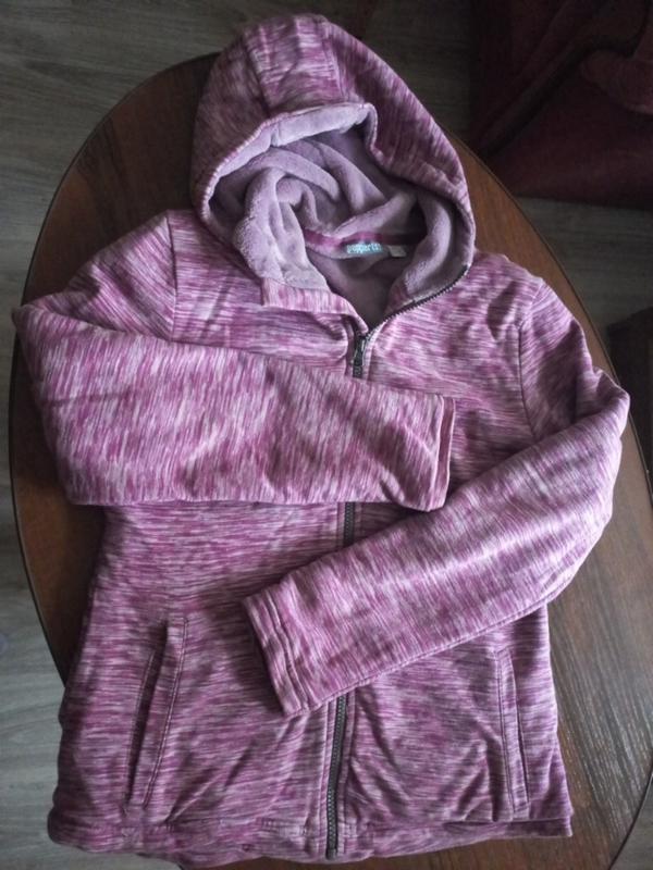 Ну, очень теплая, мягкая кофта, подойдет в качестве демисезонной курточки. Полностью утепленная и рукава и капюшон. Состояние легсенкое б.у без каких-либо дефектов. Длина-60 Рукав-60 Плечи-38 под руками-45