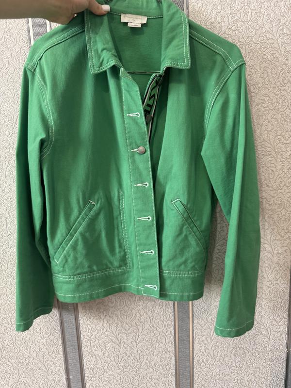 Стан нового.Джинсова куртка Stella McCartney насиченого зеленого кольору. Модель виконана з бавовни та еластану та прошита контрастною білою ниткою. Спереду розташовані дві прорізні кишені. Під відкладним коміром захований принт із логотипом. Застібка на гудзики