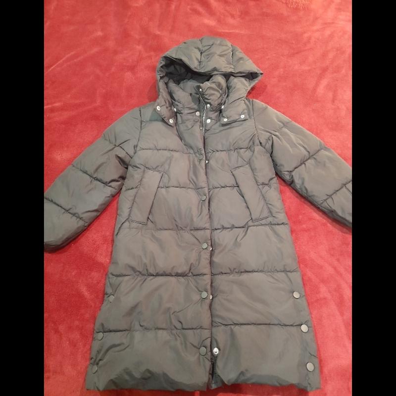 Классная качественная куртка, за колени, как пальто, на синтепоне известной фирмы H&M в очень хорошой схватке, носилась мало. Отстегивающийся капюшон. Есть один нюанс на последнем фото - на спине маленький надрез (не сквозной), на функционал не влияет, в глаза не бросается. Замеры: длина по спине 83, полуобхват груди 45, Рукав 49-50(там резинки внутри рукава, трудно замерять), внутр шов 37, плечо 10.